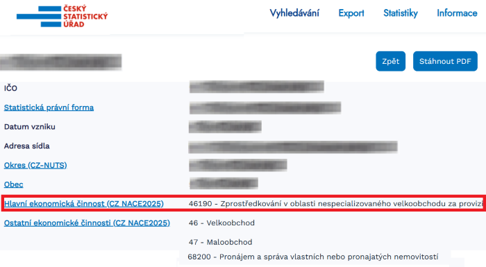 5) Zobrazí se Identifikační údaje příslušného subjektu. Ve výpisu je uvedena HLAVNÍ EKONOMICKÁ ČINNOST (CZ NACE2025). V příslušném řádku je nejprve uveden číselný kód CZ NACE2025 a dále je odpovídající textový přepis CZ NACE2025.